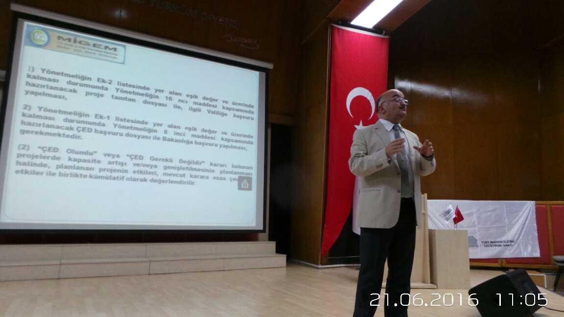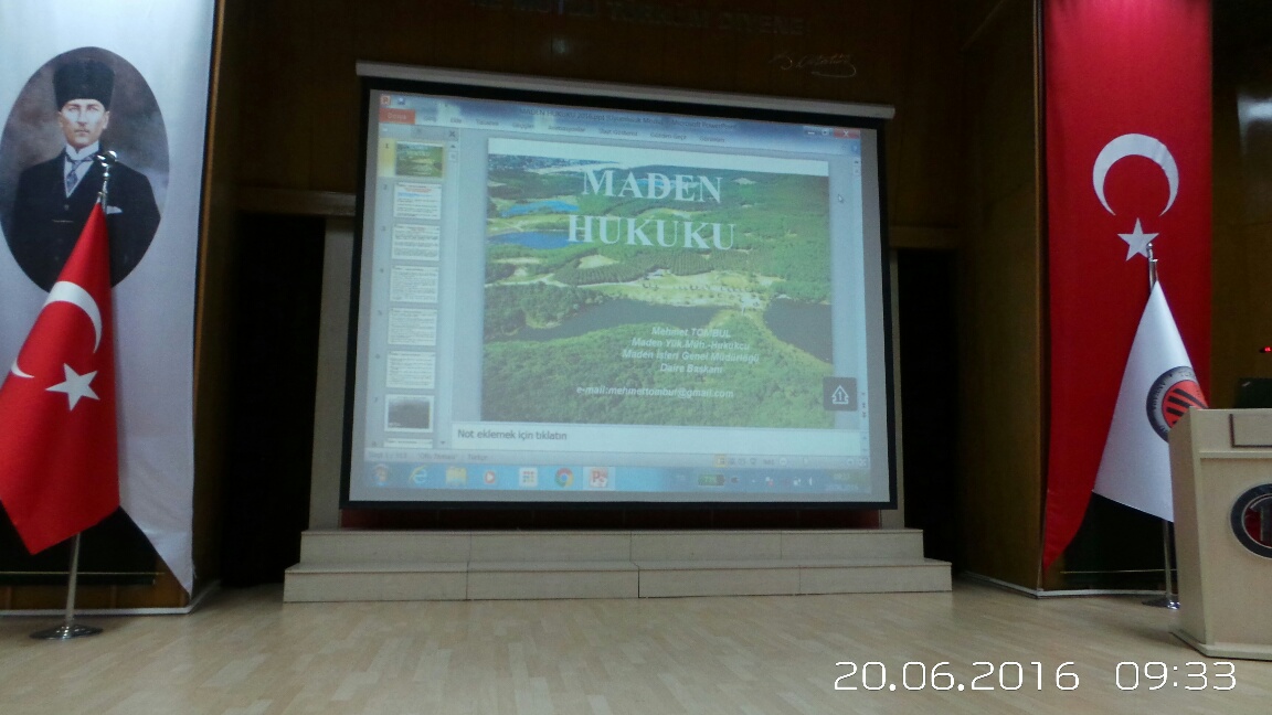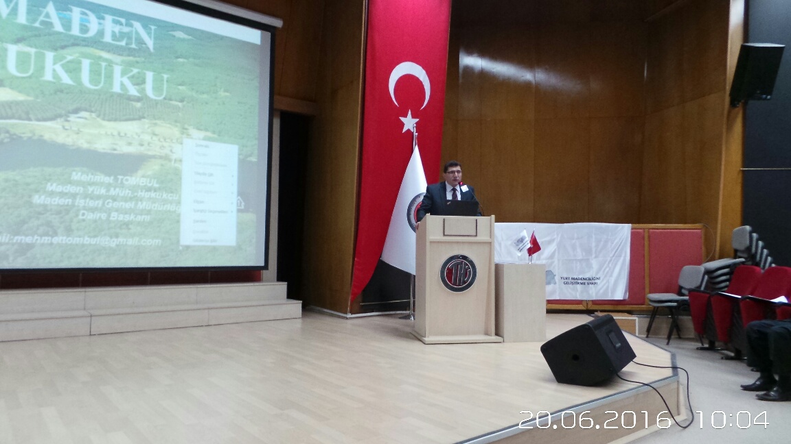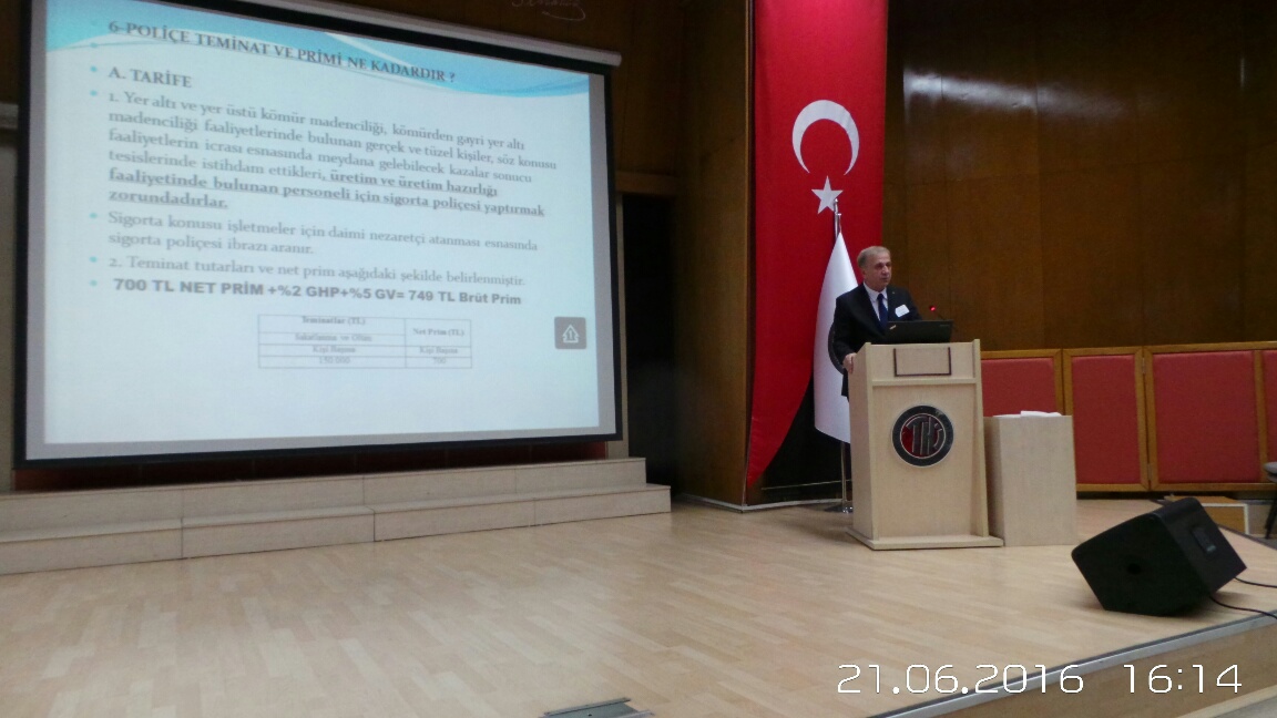 Yurt Madenciliğini Geliştirme Vakfı tarafından 20-21.06.2016 tarihlerinde T.K.İ. Genel Müdürülüğünde düzenlenen "Maden, Çevre ve Orman Mevzuatında Son Durum ve Uygulamalar" seminerine Dernek Yöneticilerimiz Sayın Ulaş Erdoğan ve Sayın Sedat Urkaya katılım göstererek MADEN ÇALIŞANLARI ZORUNLU FERDİ KAZA SİGORTASI TEBLİĞİ KAPSAMINDA YAPILAN RİSK İNCELEME FAALİYETLERİ ve SİGORTA EKSPERLİĞİ mesleği hakkında sunum yapmışlardır.