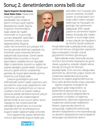 Aksigorta Genel Müdürü Uğur Gülen:Maden Çalışanları Zorunlu Ferdi Kaza Sigortası’nın zorunlu hale getirilmesindeki temel sebep, devletin maden ocaklarını kontrol altına almak istemesidir. Yaşanan Soma faciasından sonra pek çok ocak kontrol edildi. Bu poliçeyi sigorta şirketlerinin düzenlemesiyle devletin maden işletmelerini denetleme görevini bir nevi sigorta şirketleriyle paylaşmış olacak ve maden ocaklarında otokontrol sağlanacak. Tam bir başarı sağlamak için ürünün zorunlu kılınmasının yanı sıra ek düzenlemelerle itici bir güç de oluşturmak faydalı olacaktır. Bunun en yakın örneğini DASK’ta yaşadık. Ürün elektrik-su abonelik sözleşmelerinde, tapu işlemlerinde aranan bir poliçe haline getirildi. Bu nedenle madenlerin herhangi bir kamu kurumu ile işlem yapacak ise bu poliçeyi ibraz etme zorunluluğu getirilmesini son derece olumlu buluyoruz ve bu tip uygulamaların artırılmasının doğru olduğunu düşünüyoruz. Prim hacmi olarak tüm maden işletmelerinin asgari sigortalama koşullarını sağladığını varsayarak tüm işçilerin sigortalanması durumunda beklenti prim hacmi oldukça yüksek, 50 milyon TL bandının bile üzerinde… Ürünün en önemli etkisi sosyal anlamda olacaktır. Şu an sonuçlanan raporların bir kısmında olumsuz rapor çıkıyor ve işletmenin asgari sigortalama koşullarını sağlamaması sebebiyle poliçe düzenlenemiyor. İşletmeye verilen 45 günlük sürede eksperin önerileri yerine getirilirse poliçenin düzenlenmesi ve işletmenin çalışmaya devam etmesi mümkün oluyor.