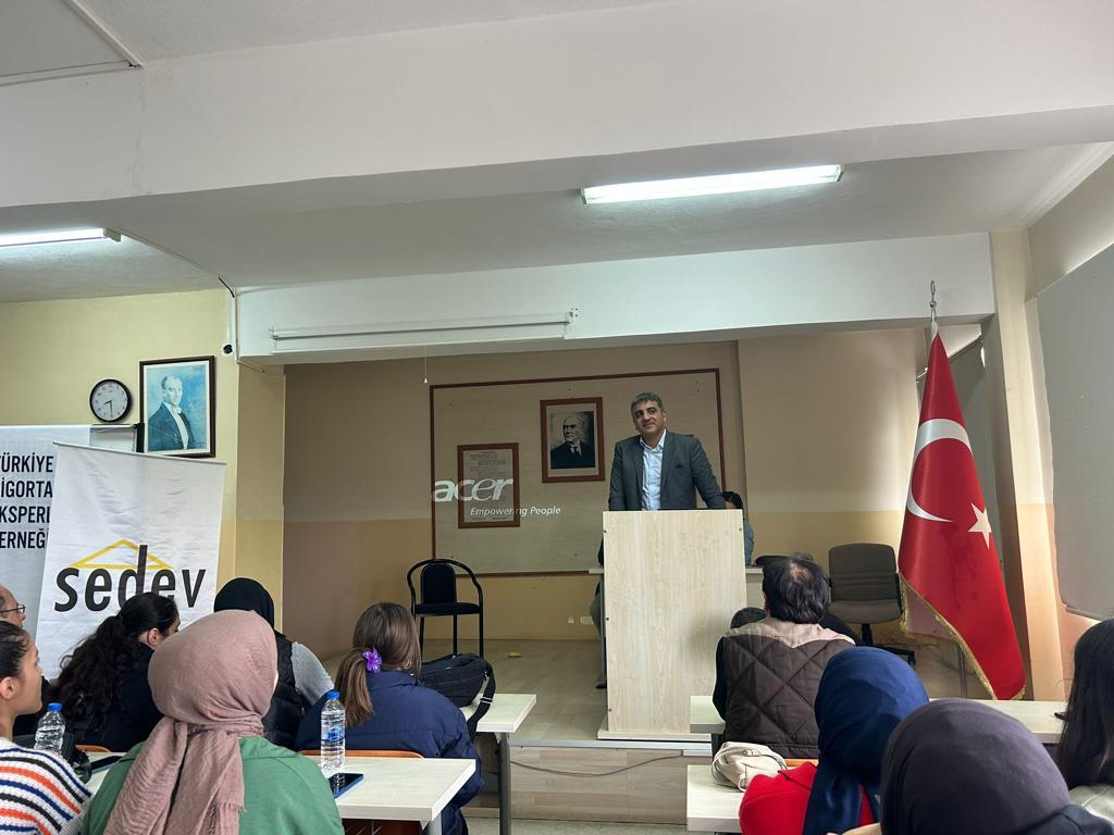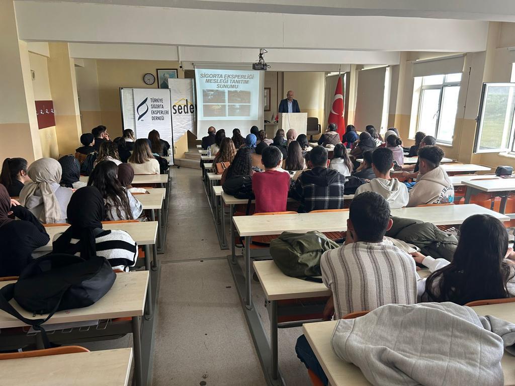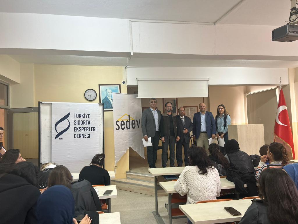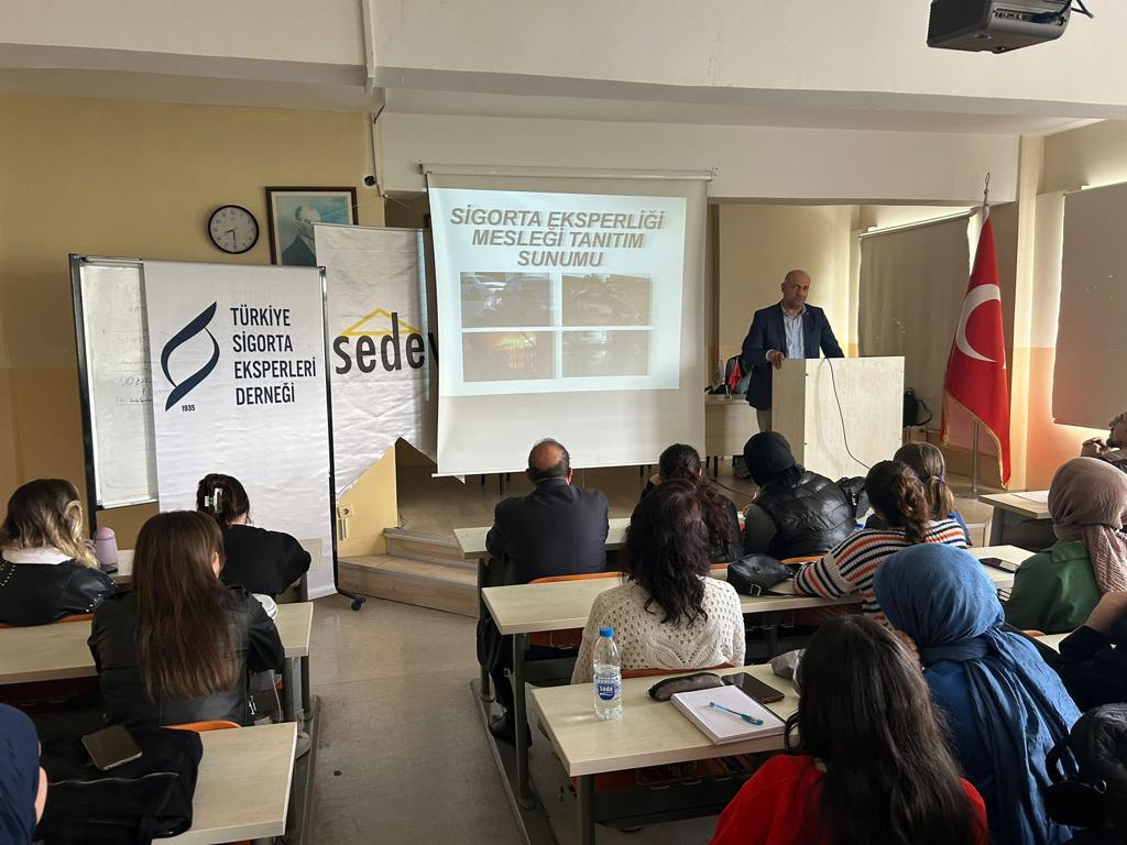 TOBB SEİK ve Türkiye Sigorta Eksperleri Derneği Yönetim Kurulu Üyemiz Sayın Adem İREN, Sigorta Eksperliği Mesleği Tanıtım sunumunu gerçekleştirerek eksperlik mesleğinin hukuki tanımı, Türk sigorta sektöründeki stratejik önemi, ekspertiz süreçleri, eksperlik mesleğinin yurt dışı uygulamaları ile ülkemizdeki durumunun karşılaştırılması, süreç yönetimi ve mesleğin geleceğinin planlanması gibi önemli konularda bilgiler verdi. Yine Türkiye Sigorta Eksperleri Derneği Sicil Kurulu Üyemiz Sayın Selahattin Eyüp ŞİMŞİR gelen soruları da cevaplandırarak, geleceğin sigortacılarına hem sektör hem de eksperlik mesleği ile ilgili bilgilerini aktardılar.