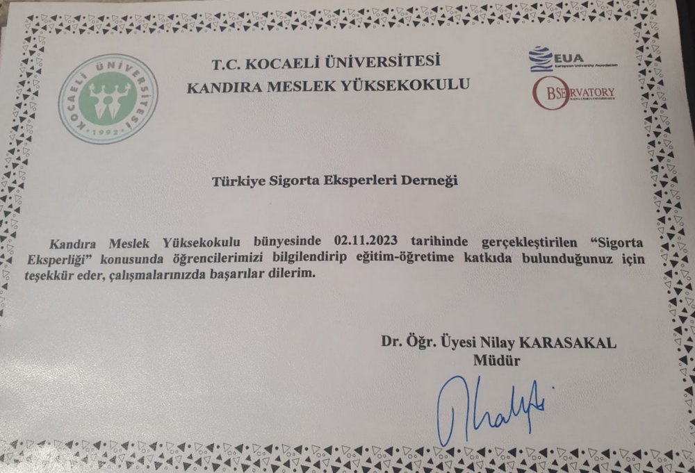 02 Kasım 2023 tarihinde Türkiye Sigorta Eksperleri Derneği ve Sigorta Eksperleri Dayanışma ve Eğitim Vakfı olarak Kocaeli Üniversitesi Kandıra Meslek Yüksekokulu Bankacılık ve Sigortacılık Bölümü Öğrencileri ile bir araya geldik.