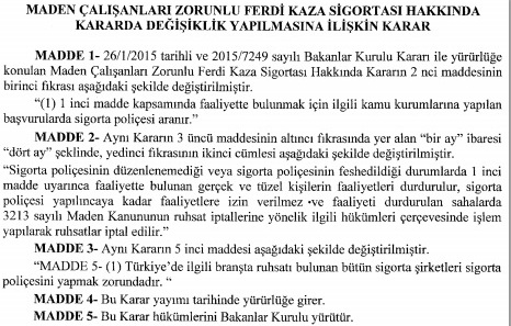 Maden Çalışanları Zorunlu Ferdi Kaza Sigortası Hakkında Kararda Değişiklik Yapılmasına İlişkin Karar (2015/7707)