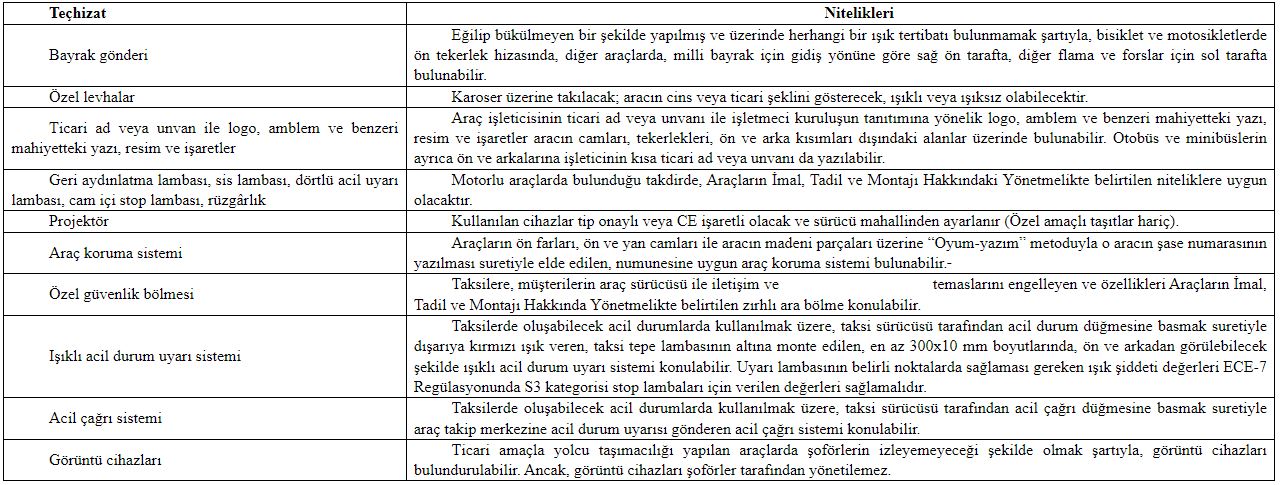 Taksi: Yapısı itibariyle sürücüsü dahil en fazla dokuz oturma yeri olan, insan taşımak için imal edilmiş bulunan ve Bilim, Sanayi ve Teknoloji Bakanlığı tarafından belirlenen şekilde muayenesi ve damgası yapılmış, ücret hesaplama yöntemine uygun tarife yüklenmiş ve tip onayı alınmış taksimetre ile yolcu taşıyan M1 sınıfı ticari motorlu araçtır.