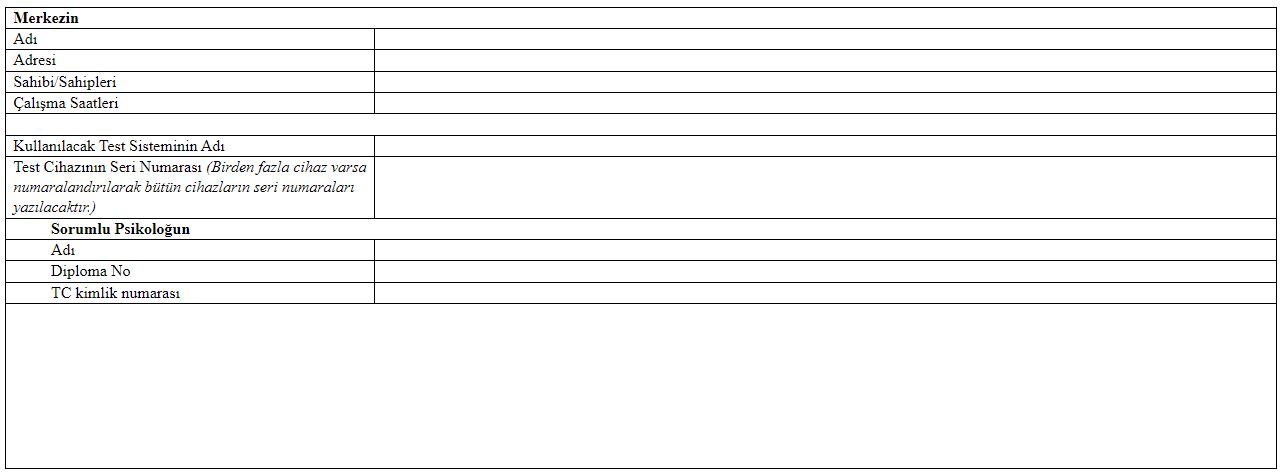10 | Merkezde yetki belgesi olmayan kişiler tarafından test uygulanıyor mu? | Süre verilmez. | Merkezin faaliyeti 1 ay durdurulur. Kişiler ve merkezin sahipleri hakkında Türk Ceza Kanununa göre işlem yapılır. | ||